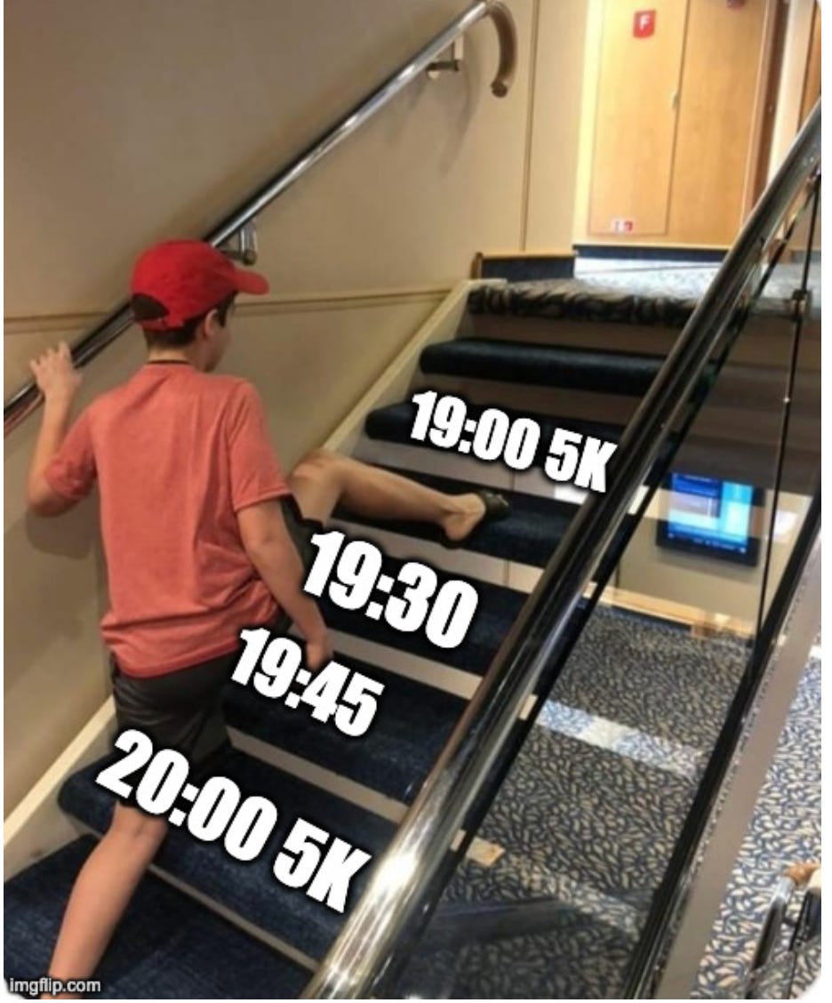 However, I also often see athletes trying to skip steps in the totality of their performance. For example, an athlete that has run a 20:00 5K may be overly focused on running a 19:00 5K instead of 19:50, 19:40, 19:30, etc first. By reaching too many steps ahead, they may fail to properly prepare for the next step in front of them. Moreover, it can manifest into athletes repeatedly attempting to train with the fitness they want in the months or years down the road, instead of the fitness they have right now. Collectively, this may perpetuate a cycle of suboptimal preparation despite a willingness and dedication to put in the work.